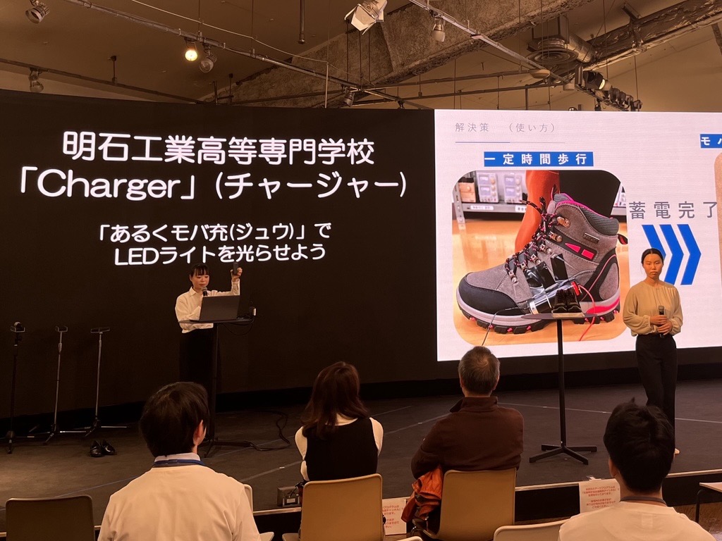 北畑さんと斉藤さんは、登山中の電池切れによる不便さに着目し、歩行時の圧力を電気に変換する発電機を登山靴に組み込んだ「あるくモバ充」を開発しました。