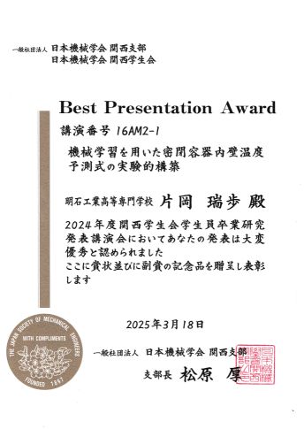 機械工学科5年生・片岡瑞歩君が、令和7年3月18日(火)に大阪公立大学で開催された日本機械学会関西支部2024年度関西学生会卒業研究発表講演会においてBPA(Best Presentation Award)を受賞しました。