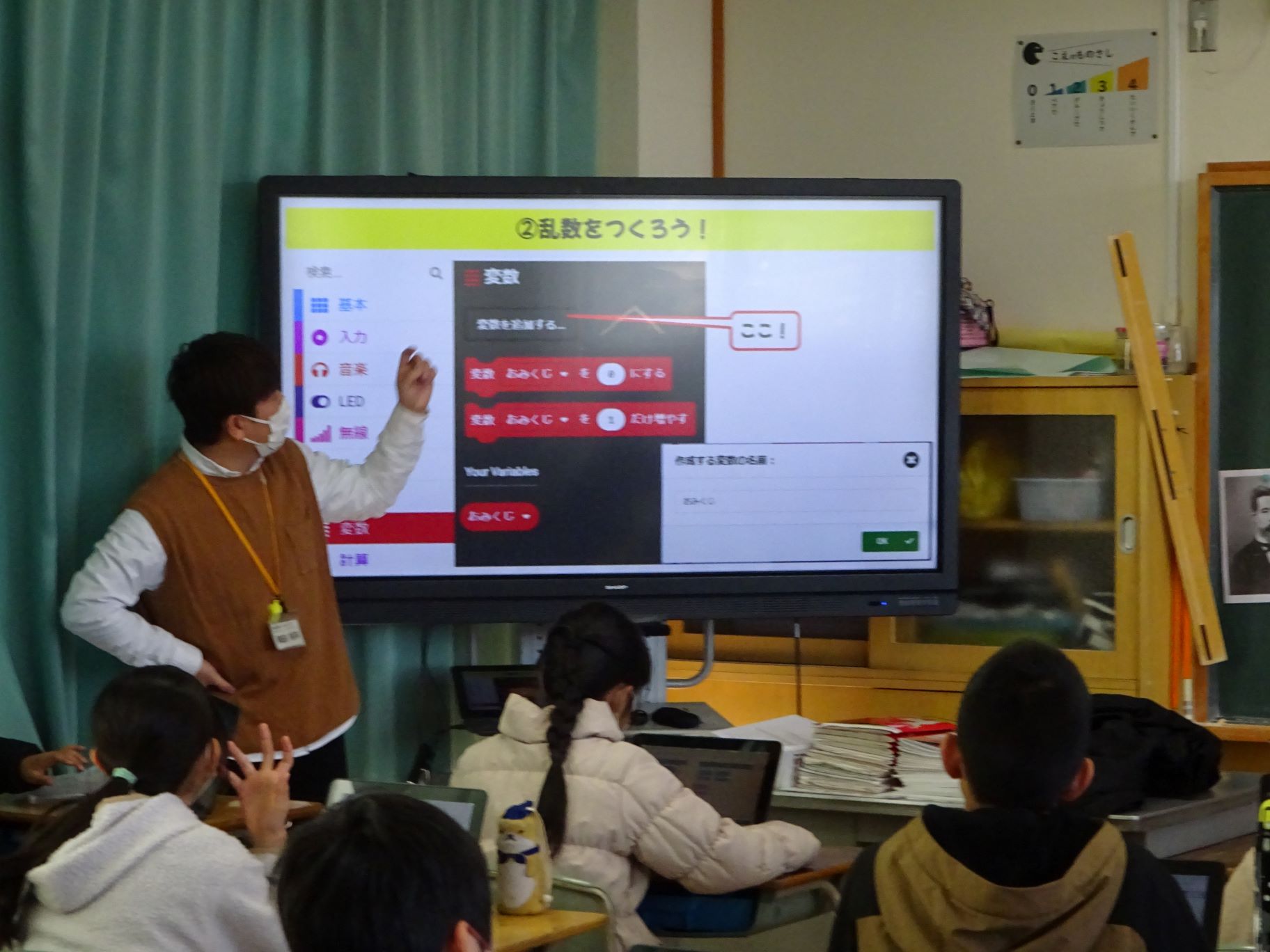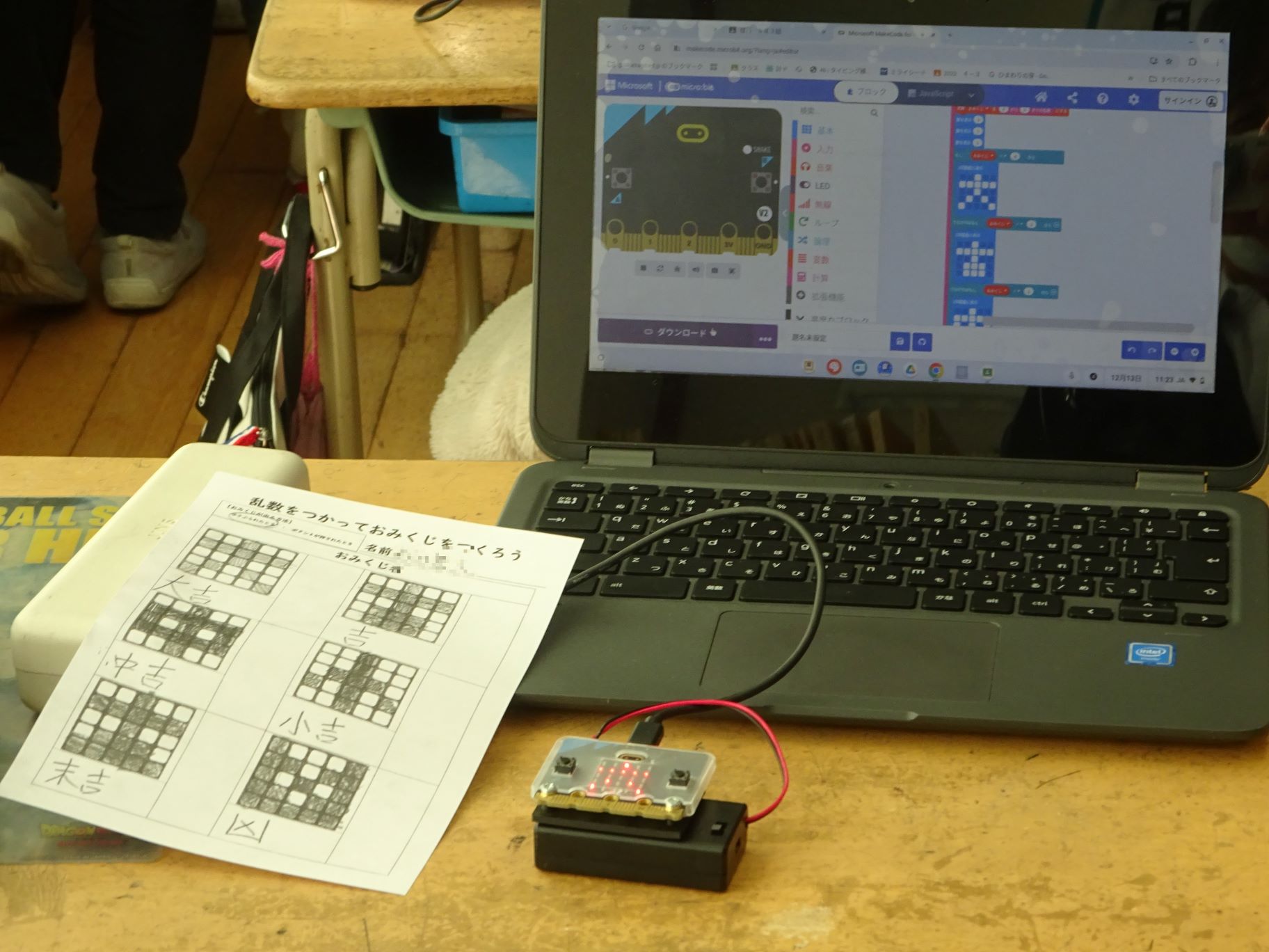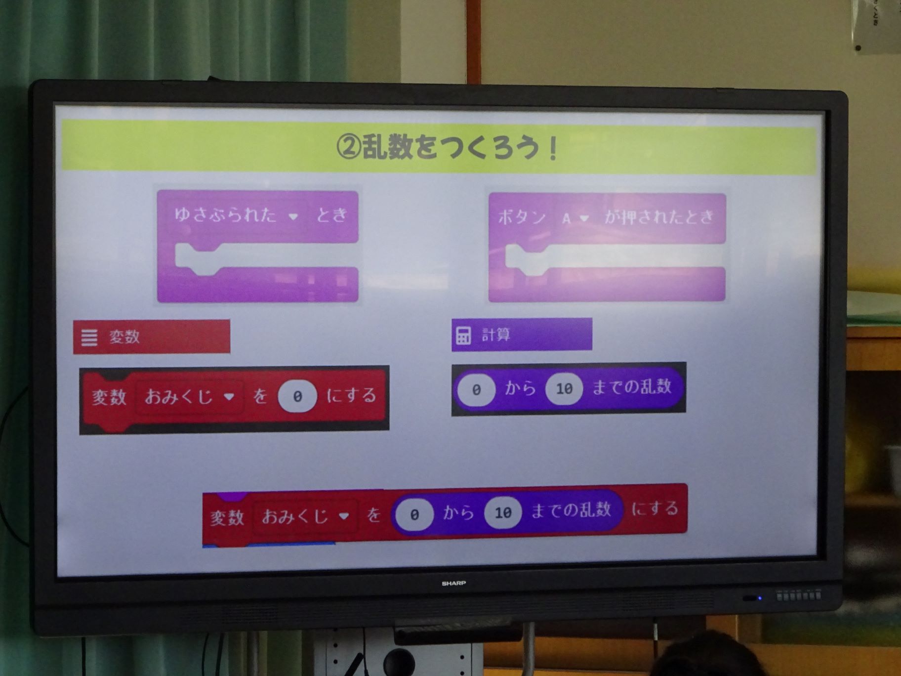 今回の共同授業は、micro:bitを教材として使用し、「おみくじ」をランダムにLEDに表示させるプログラミングを作成しました。