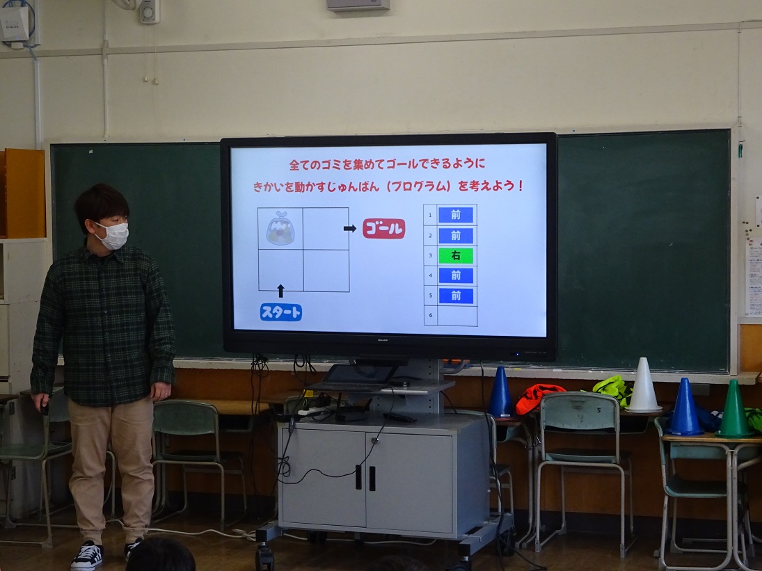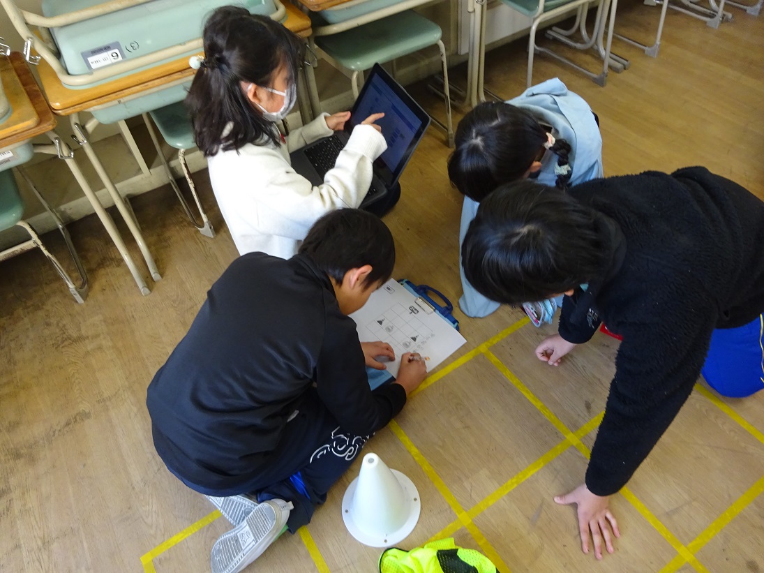 3年生の授業では、コンピュータを使わないプログラミング(アンプラグドプログラミング)の方法で、「おそうじロボットになって教室をそうじしよう」と題し、スタート地点から障害物を回避してゴミを拾いゴールするプログラムを行いました。