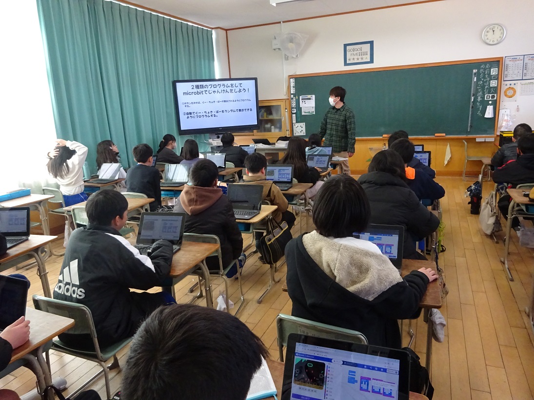 今回の共同授業では、3年生は「動作を教えてゴールしよう(コンピュータを使わないプログラミング)」、5年生は「2種類のプログラムをしてmicro:bitでじゃんけんをしよう!」を実施しました。また、放課後には、3~6年生の親子ペアを募集し、「micro:bitを用いてポーカーゲームをしよう」を実施しました。