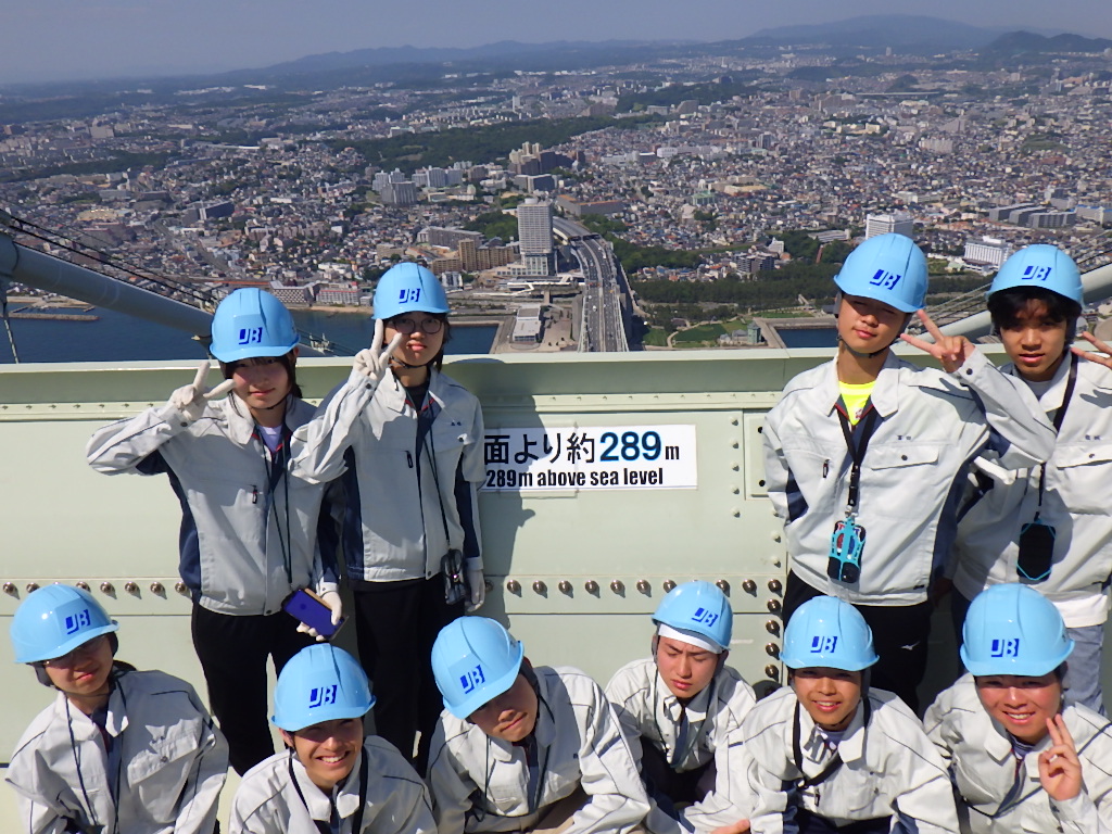 先日、1年生の「都市システム工学概論」の授業の一環として、建設当時、世界最長の吊り橋である明石海峡大橋の塔頂に行ってきました。当日は天候にも恵まれ、塔頂からの絶景を楽しむことができました。主塔までの往復の間には、明石海峡大橋の建設に使用された材料や技術、現在実施されている維持管理技術の解説を受けました。また、質問にも丁寧に回答いただき、多くの学びと刺激を受けた現場見学会となりました。