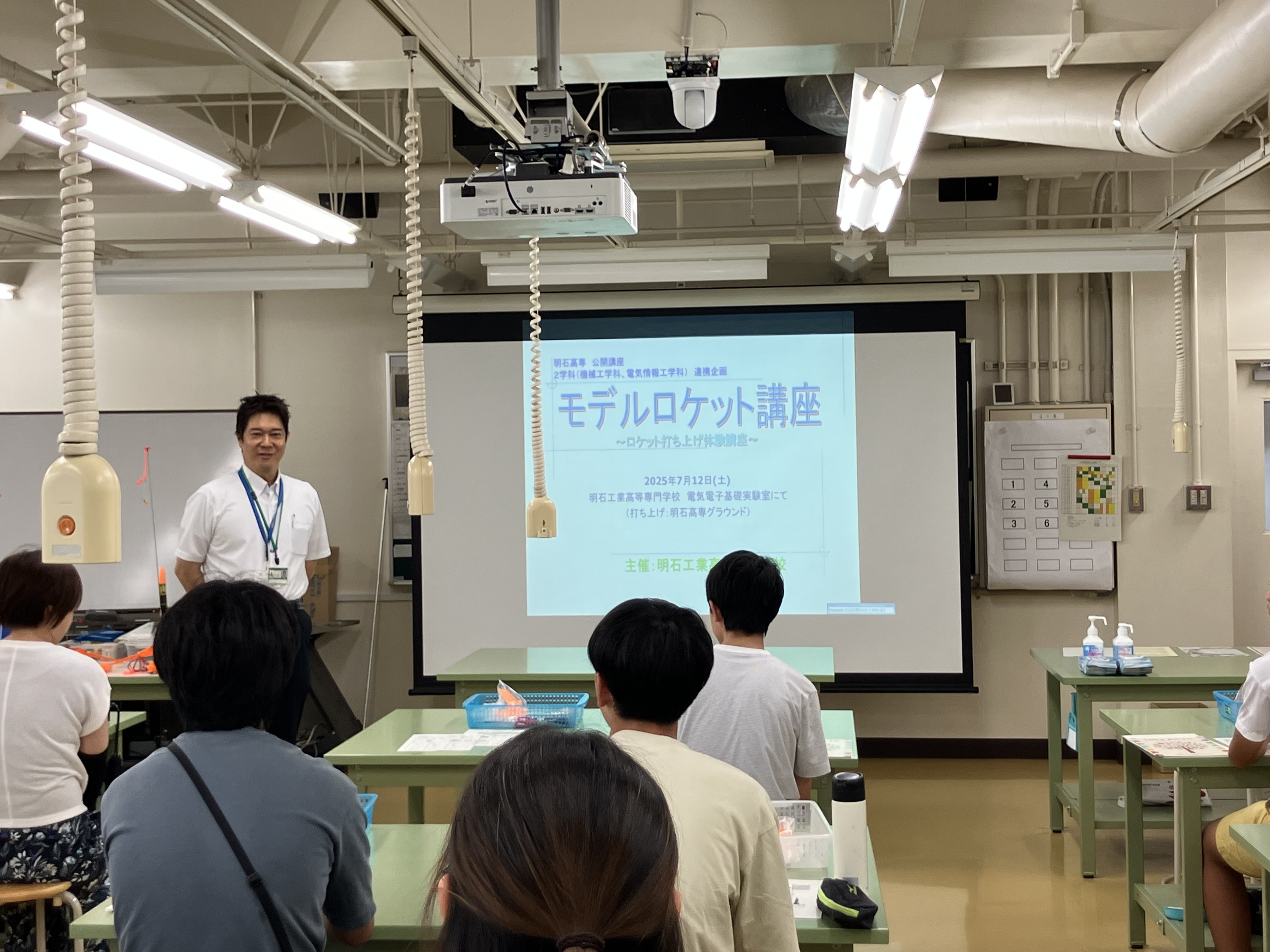 令和7年7月12日(土)、明石高専にて電気情報工学科・機械工学科の連携によるモデルロケット講座が開催されました。