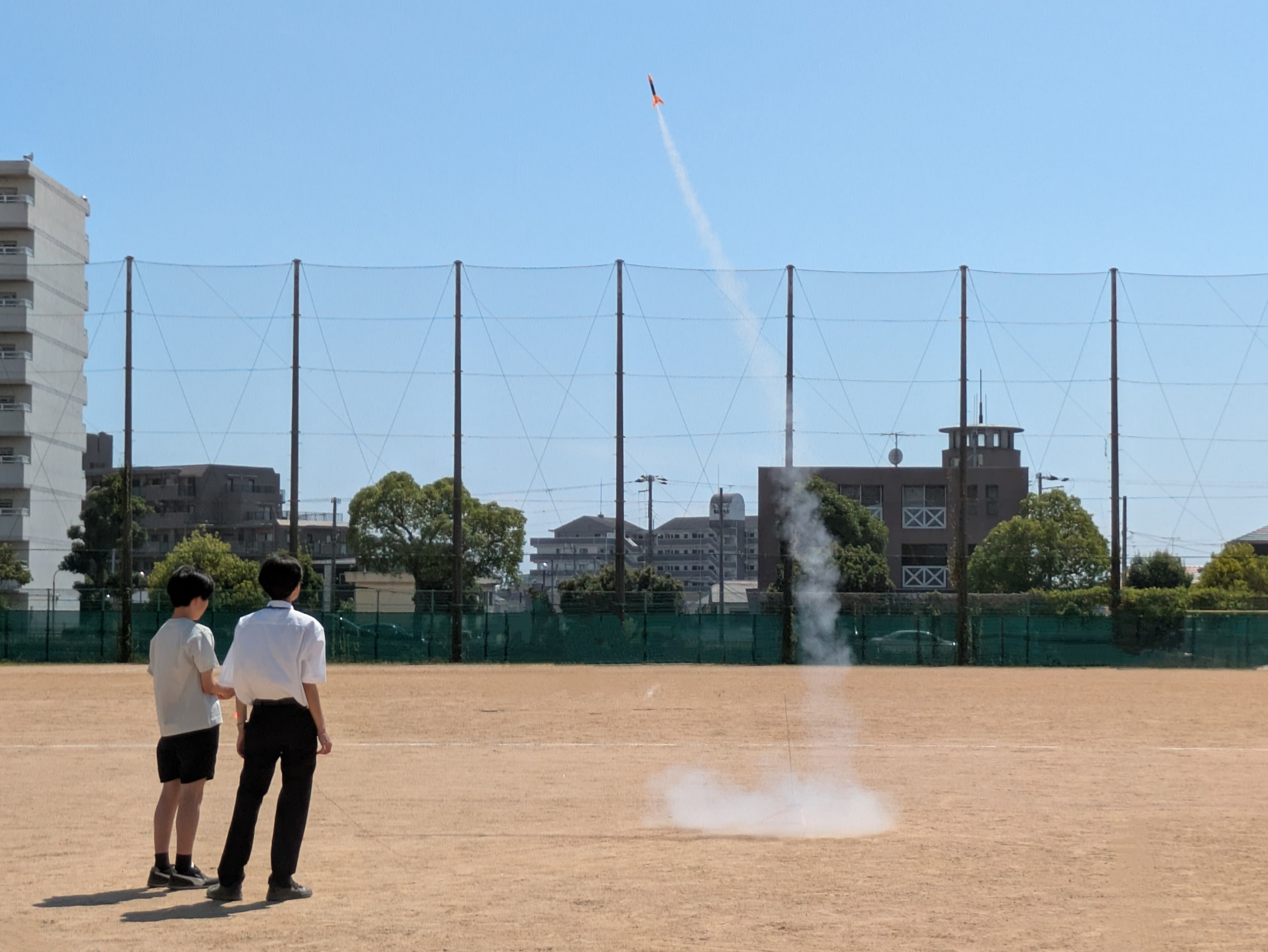午後は天候にも恵まれ、雲ひとつない快晴のもとグラウンドにてロケットの打ち上げを実施しました。受講者全員のロケットが無事に打ち上げ・回収され、全員がモデルロケット4級ライセンスを取得しました。自分で組み立てたロケットが無事に打ち上がり、受講者は大変嬉しそうな表情を見せていました。