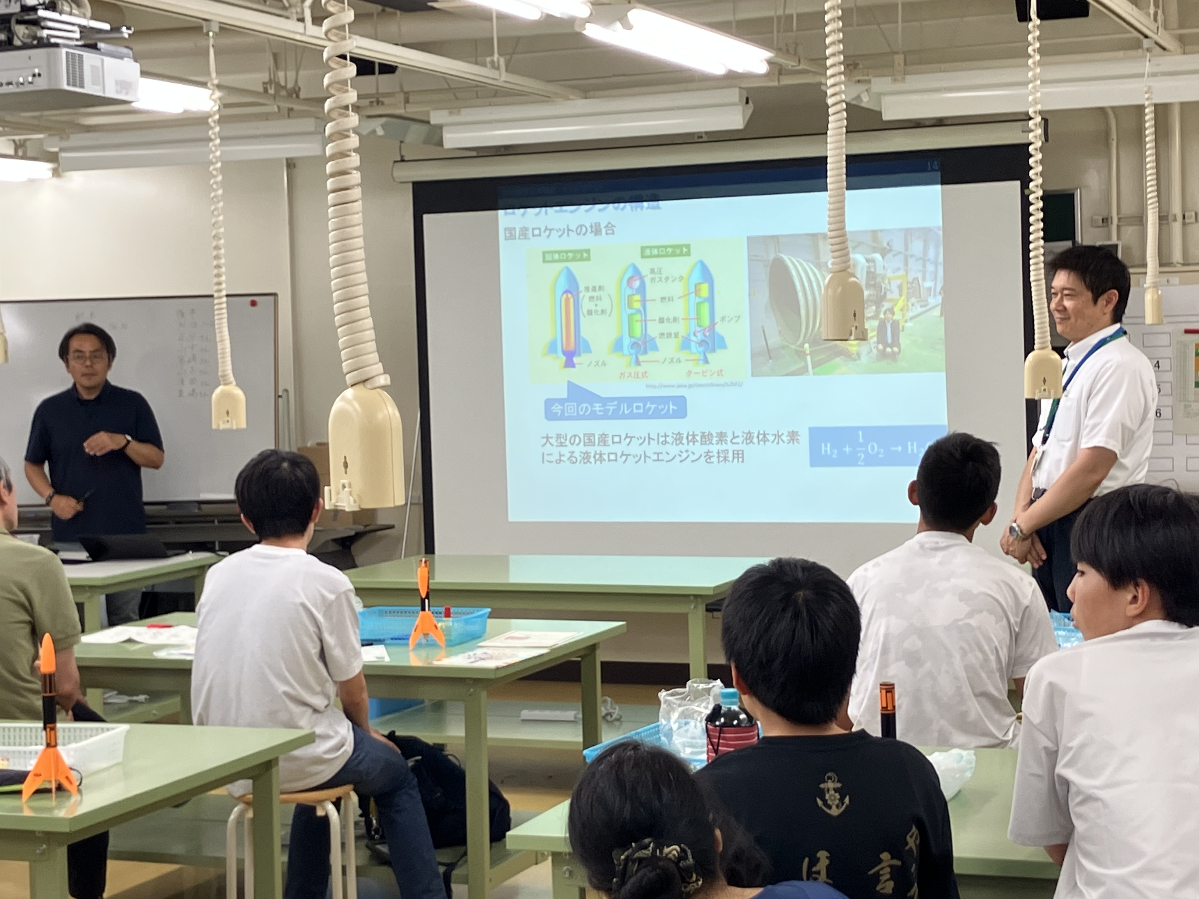 打ち上げ後は教室に戻り、田中准教授によるロケットエンジンの仕組みに関する講義が行われ、講座を締めくくりました。