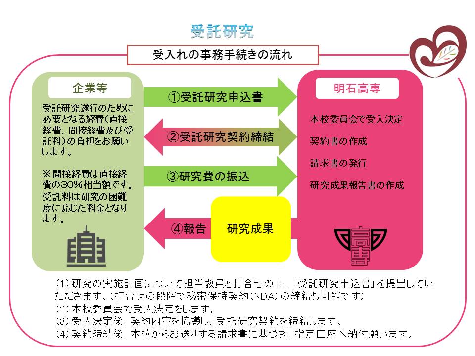 本校において、民間企業等から委託を受け、本校教員が公務として行う研究でその成果を委託者に報告します。委託者は、これに要する経費を負担します。